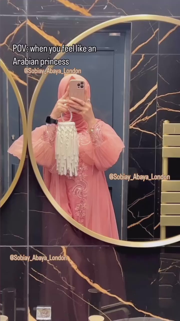 Step into luxury with the Pink Arab Princess Abaya, designed to make you feel like royalty. This exquisite abaya features a two-layer design, with a net fabric outer layer that adds a delicate, airy touch. The second layer is beautifully adorned with intricate hand embellishments and embroidery, creating a stunning, eye-catching effect. The abaya also boasts elegant puffy sleeves, adding volume and grace to your look. Perfect for special occasions, this abaya exudes sophistication and grandeur, giving you that luxurious, princess-like feel. Whether for a grand event or a stylish evening out, this abaya ensures you stand out in the most elegant way.
