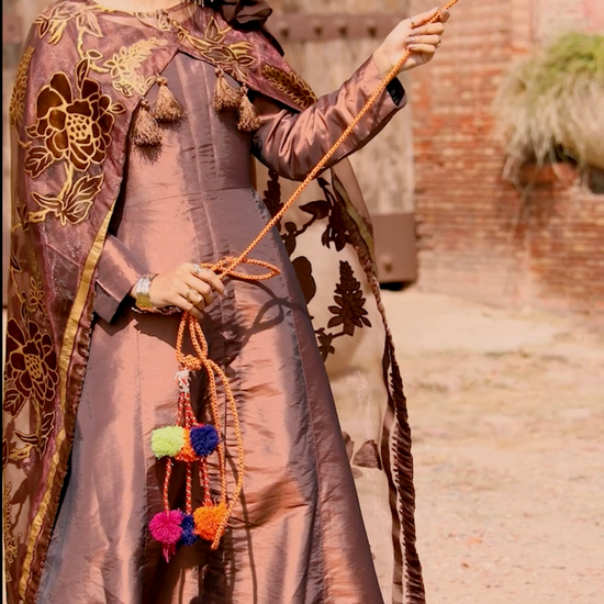 The Bronze Reverie 3-Piece Abaya Set brings together luxury and grace in one timeless ensemble. Crafted from smooth raw silk in a deep brown shade that complements every skin tone, this outfit is the perfect balance of sophistication and comfort. The star of the look — a Palachi organza cape — features delicate gold floral embroidery that glimmers beautifully with movement. Underneath, a matching silk dress creates a refined base, while the tailored trousers add a modern edge and effortless wearability. Designed for formal events, weddings, and luxury occasions, this 3-piece set embodies contemporary elegance with a royal finish.